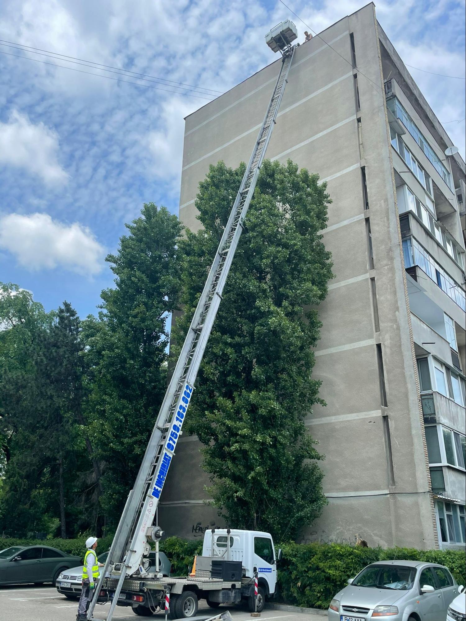 Montăm liftul profesional stabilizat complet. Ridicarea este făcută controlat, cu operator dedicat, fără improvizații și fără riscuri inutile.